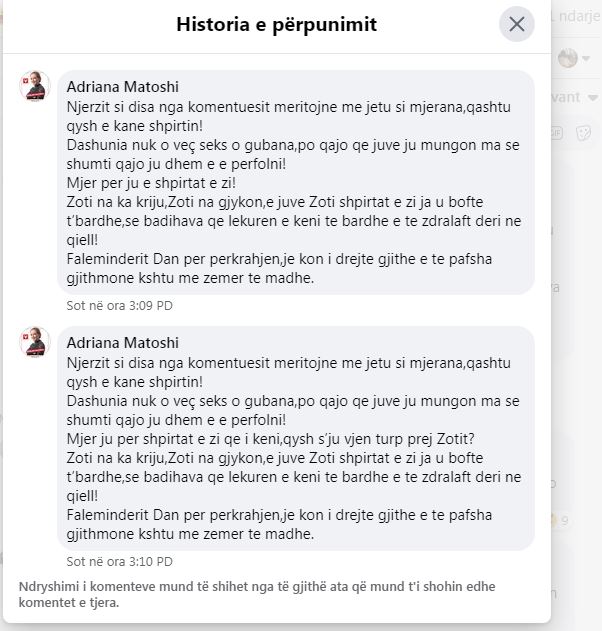 “Njerëzit si disa nga komentuesi meritojnë të jetojnë si mjerana, qashtu qysh e kanë shpirtin! Dashuria nuk është veç seks o gubana, po ajo që juve iu mungon më së shumti, ajo që ju dhemb e përflitni! Mjer ju për shpirtrat e zi që i keni, qysh s’ju vjen turp prej Zotit? Zoti na ka krijuar, Zoti na gjykon, e juve Zoti shpirtrat e zi jua bëftë të bardhë, se badihava që lëkurën e keni të bardhë e të zdralaftë deri në qiell! Faleminderit Dan për përkrahjen, ke qenë i drejtë gjithë e të pafsha gjithmonë kështu me zemër të madhe”/InLajmi/