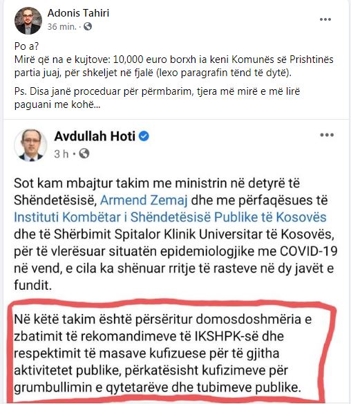 Tahiri ia ka kujtuar Hotit që ia ka borxh 10,000 euro komunës së Prishtinës LDK për shkelje të rregullave anti-Covid.