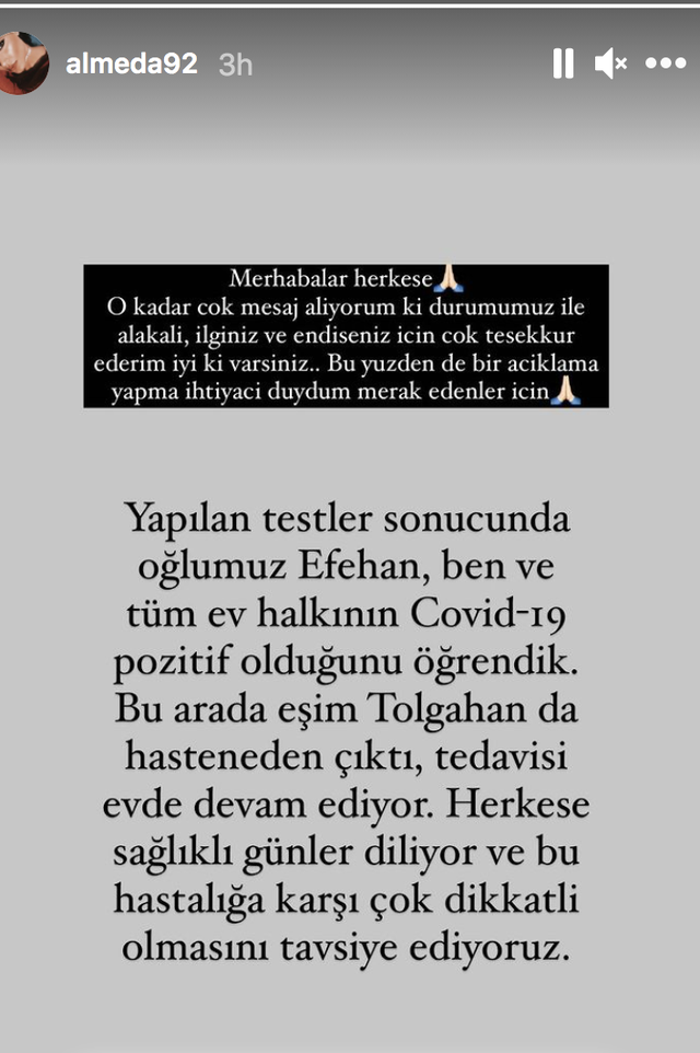 Si rezultat i testimeve, mësuam se djali ynë Efehean, unë dhe gjithë anëtarët e tjerë të shtëpisë jemi pozitiv me Covid-19. Meqë ra fjala, bashkëshorti im Tolgahan ka dalë nga spitali, trajtimi i tij vazhdon në shtëpi. Ju urojmë të gjithëve shëndet dhe ju këshillojmë të tregoni kujdes ndaj sëmundjes”, ka shkruar Almeda në një postim në Instagram.
