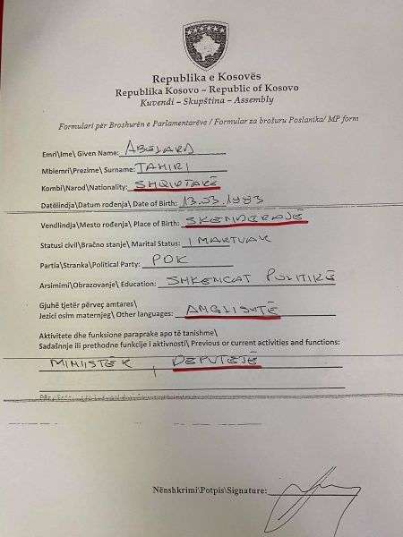 Ish ministri i Drejtësisë në Formularin për Broshurën Parlamentare e ka shkruar gabim emrin e vendlindjes së tij. Emrin e qytetit Skenderaj e ka shkruar Skenderajë dhe poashtu fjalën anglisht e ka shkruar anglishtë.