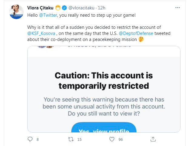 Ish-ambasadorja e Kosovës në Shtetet e Bashkuara të Amerikës, Vlora Çitaku njoftoi në Twitter se llogaria e Forcës së Sigurisë së Kosovës në këtë rrjet social është mbyllur përkohësisht.