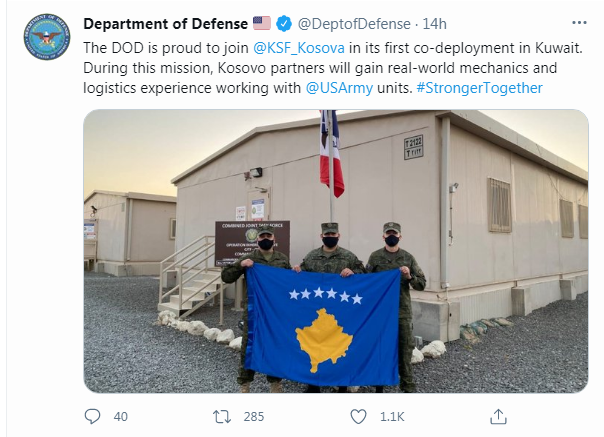 “Departamenti i Mbrojtjesështë krenar të bashkohet me Forcën e Sigurisë së Kosovës në misionin e parë në Kuvajt. Gjatë këtij misioni, partnerët tanë nga Kosova do ta fitojnë përvojën e mekanikës dhe logjistikës duke punuar me njësitë e Ushtrisë Amerikane #BashkëMëTëFortë”, shkroi Departamenti Amerikan i Shtetit.