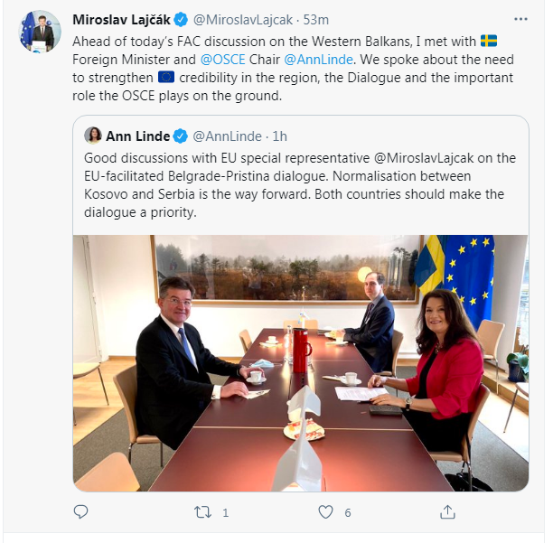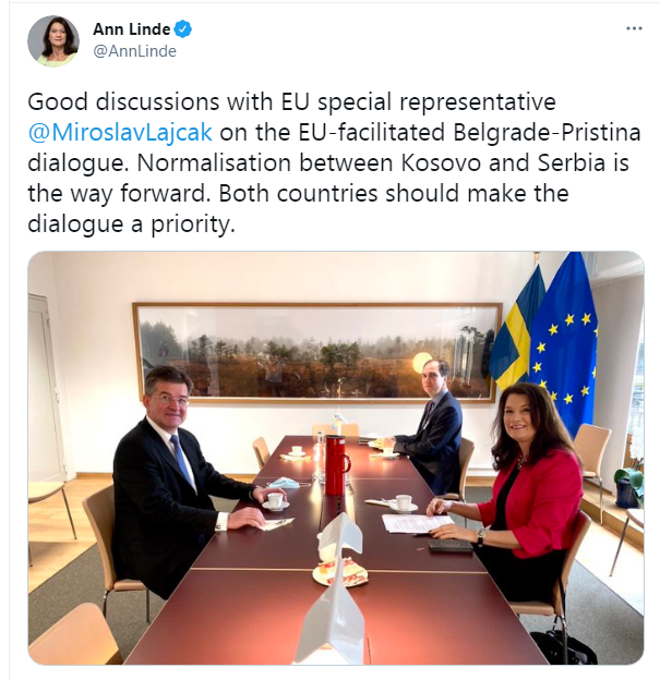 “Një diskutim i mirë me përfaqësuesin special të BE-së, Mirosllav Lajçak, për dialogun Beograd – Prishtinë të ndihmuar nga BE-ja. Normalizimi i marrëdhënieve Kosovë – Serbi është rruga para. 2 shtetet duhet ta bëjnë prioritet dialogun” , ka shkruar Ann Linde, transmeton Telegrafi.