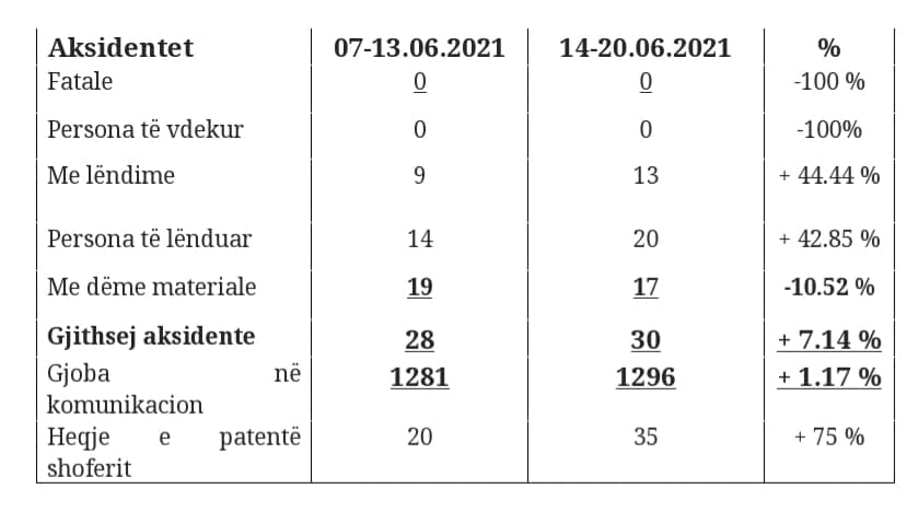 Përmbledhja e rasteve të aksidenteve të komunikacionit dhe gjobat e shqiptuara, për një javë, të krahasuara.