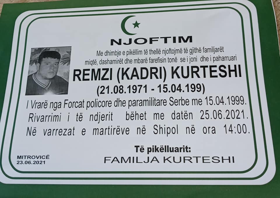 Me dhimbje e pikëllim të thellë njoftojmë të gjith familjarët miqtë dashamirët dhe mbarë farefisin tonë se i joni dhe i paharruari daja jem. Remzi kurteshi i lindur më.21.08.1971.në Mitrovicës është rrëmbyer nga forcat serbe më 15.04.1999 në pjesën veriore të Mitrovicës sad u gjin kofoma e tina ivdekur.Rivarrimi i të ndjerit bëhet me datën 25.06.2021 Në varrezat e martirëve në Shipol të Mitrovicës.e Pamja mahet ne bajr te shkolla villore Ismajl Qemajli ne Mitrovicë. /InLajmi/