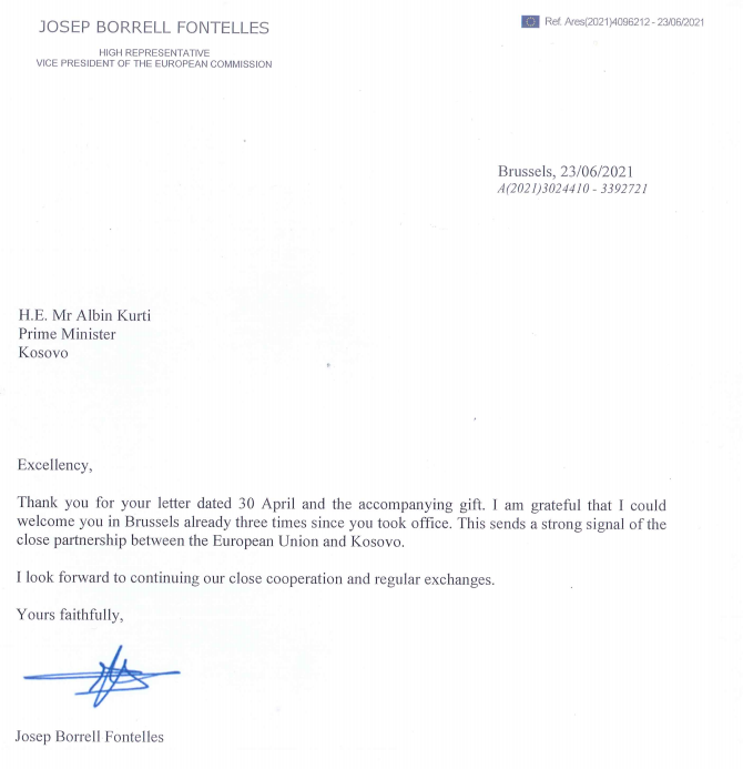 Duke iu falënderuar për letrën që Kryeministri Kurti ia ka dërguar, Borrell shprehet mirënjohës për takimet e përbashkëta në Bruksel.