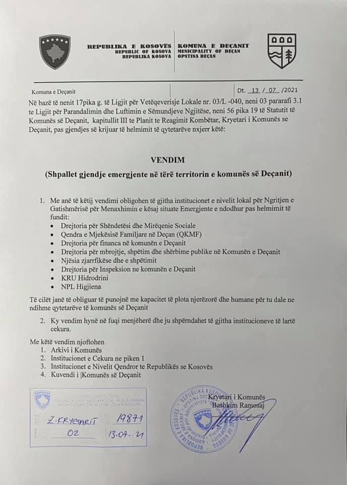 Komuna e Deçanit pas gjendjes së krijuar ku rreth 900 qytetarë dyshohet se janë helmuar nga uji ka vendosur që të shpallë gjendje emergjente, përcjell InLajmi.