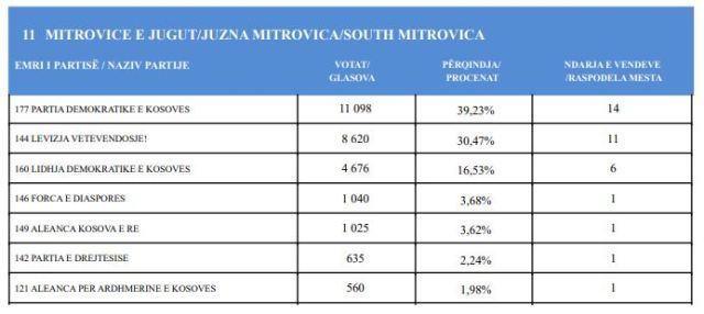 Sa i përket komunës së Mitrovicës, atje prin Partia Demokratike e Kosovës e cila ka fituar 14 vende.