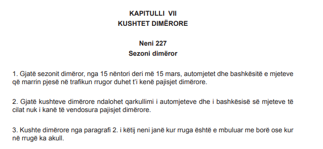 Ligji për rregullat e trafikut rrugor, Neni 227 pika e parë thotë se nga 15 Nëntori deri më 15 Mars çdo automjetë që merr pjesë në trafikun rrugor duhet t’i ketë pajisjet dimërore. /InLajmi/