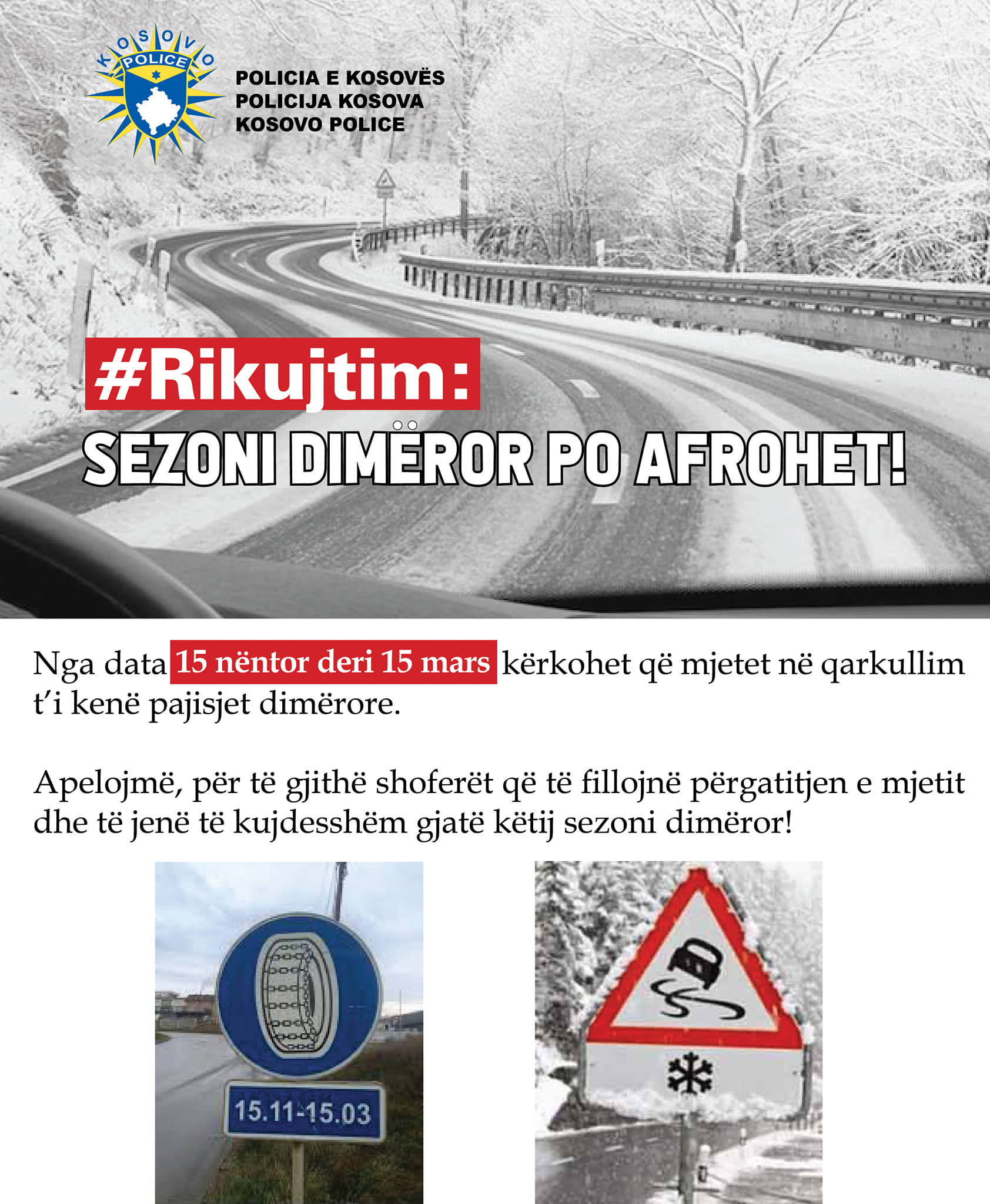 “Policia e Kosovës kërkon nga pjesëmarrësit në trafik (drejtuesit e automjeteve) që të kenë pajisjet dimërore për automjetet e tyre”, ka shkruar Policia e Kosovës. /InLajmi/