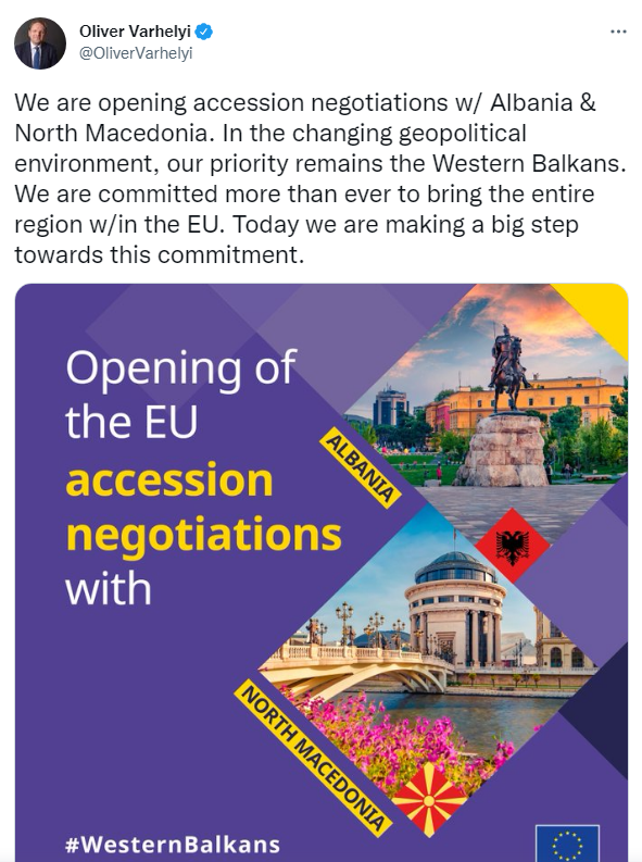 “Ne po hapim negociatat e anëtarësimit me Shqipërinë dhe Maqedoninë e Veriut . Me mjedisin gjeopolitik në ndryshim, prioriteti ynë mbetet Ballkani Perëndimor. Ne jemi të përkushtuar më shumë se kurrë për ta sjellë të gjithë rajonin brenda #BE-së. Sot po bëjmë një hap të madh drejt këtij angazhimi”, shkruan Varhelyi. /InLajmi/