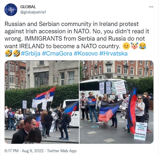 Jo, nuk e lexuat gabim. Emigrantët nga Serbia dhe Rusia nuk duan që Irlanda të bëhet një vend i NATO-s” kështu kanë shkruar në Twitter krahas fotografive nga protesta.