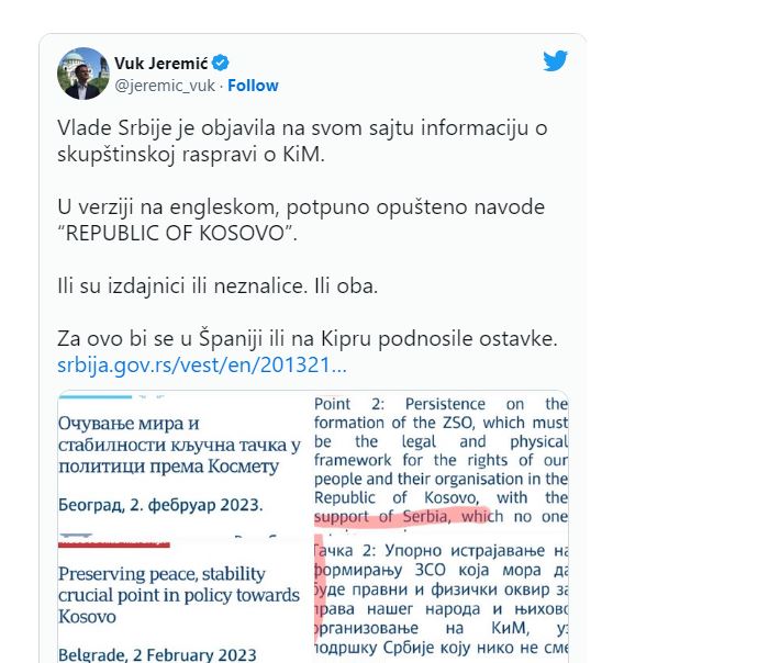 Ish-kryediplomati serb, Vuk Jeremiq e ka vërejtur këtë dhe e ka publikuar në Tëitter një pjesë të komunikatës së Qeverisë së Serbisë, përcjell Gazeta Express.