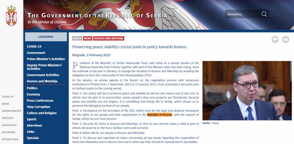 Në një komunikatë për media lidhur me këtë seancë, Qeveria e Serbisë të enjten iu referua Kosovës ashtu siç duhet: Republika e Kosovës.