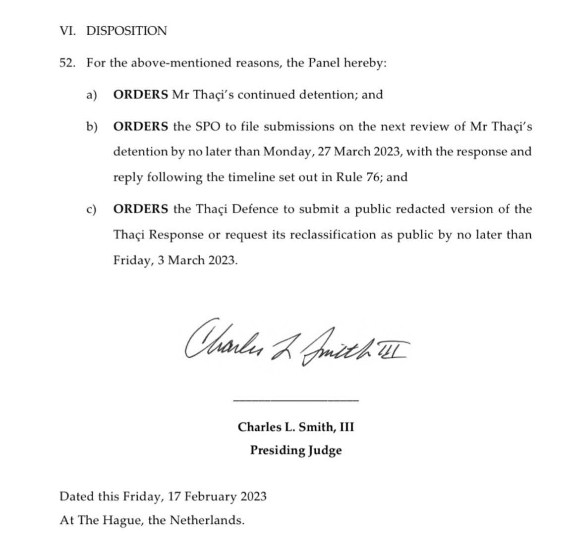 Në dokumentin, i cili mban nënshkrimin e kryetarit të Trupit Gjykues, Charles Smith, ish-gjyqtar në EULEX, i përfolur për skandale nga ish kolegët e tij, thuhet se mbrojtja mund të dorëzojë ankesat e saja me parashtresa deri më 3 mars, shkruan Lajmi.net.