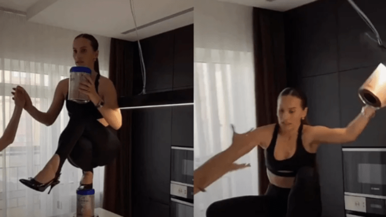 Mariana Barutkina, 32 vjeçe, u përpoq të qëndronte në ekuilibër mbi një kavanoz me ushqim për foshnje të vendosur mbi një tenxhere të përmbysur – e gjitha kjo, ndërsa mbante taka shumë të larta.
