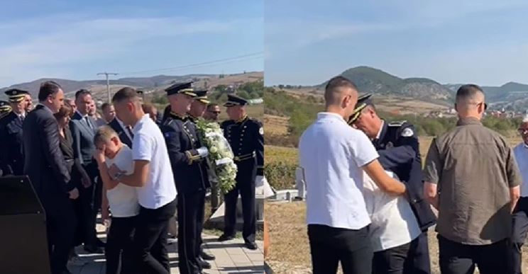 Ai shihet teksa ngushëllohet nga të pranishmit dhe zëdhënësi i policisë së Kosovës, Baki Kelani, raporton Telegrafi.com