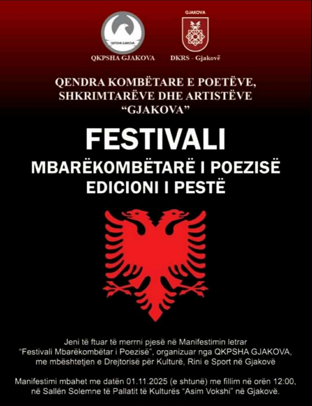 Organizuar nga Qendra Kombëtare e Poetëve, Shkrimtarëve dhe Artistëve “Gjakova”, në Pallatin e Kulturës “Asim Vokshi” në Gjakovë u mbajt Festivali Mbarëkombëtar i Poezisë, edicioni i pestë i tij, i përkrahur nga DKRS e Gjakovës, e ku lexuan numër rekord krijuesish të poezisë (72 veta)!